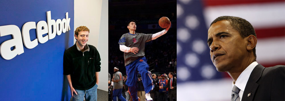 These are not the kind of people we traditionally think of as heroes in sports, technology, and politics. Compare Jeremy Lin, Mark Zuckerberg, and Barack Obama to, say, Michael Jordan, Steve Jobs, and Bill Clinton. Jordan, Jobs, and Clinton were stars in their own right. Their campaigns and their victories were about themselves. It was Jordan who made the dunks, Jobs who showed us the iPhone, and Clinton who made his presidency about himself. Lin, Zuckerberg, and Obama, on the other hand, are rather underwhelming as tribal leaders. They are leaders of the Net generation, who owe their power to the networks they can catalyze.