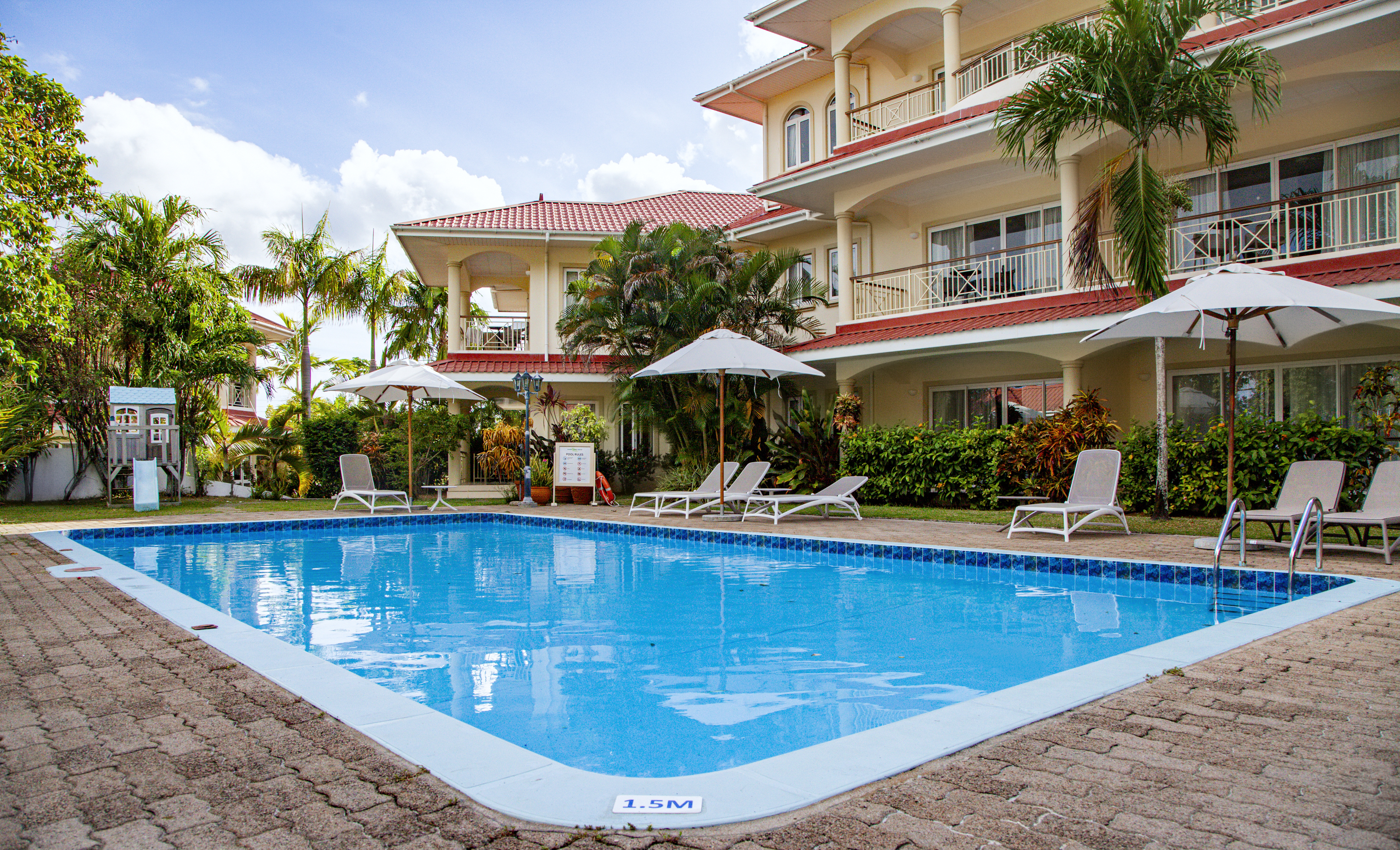 We are staying at Marie Laure Suites in Bel Ombre, about 20min ride from the airport. It is a simple and very beautiful holidays residence with just a douzaine of rooms and appartment. The place has a swimming pool which was very convenient with the kids as the beach is otherwise 15 min walk, with pretty bad sidewalks unfortunately. The owner were very nice and accomodating and recommended the driver to come pick up from the airport. There are small shops at walking distance but the restaurant are a bit of a walk if you are with kids.